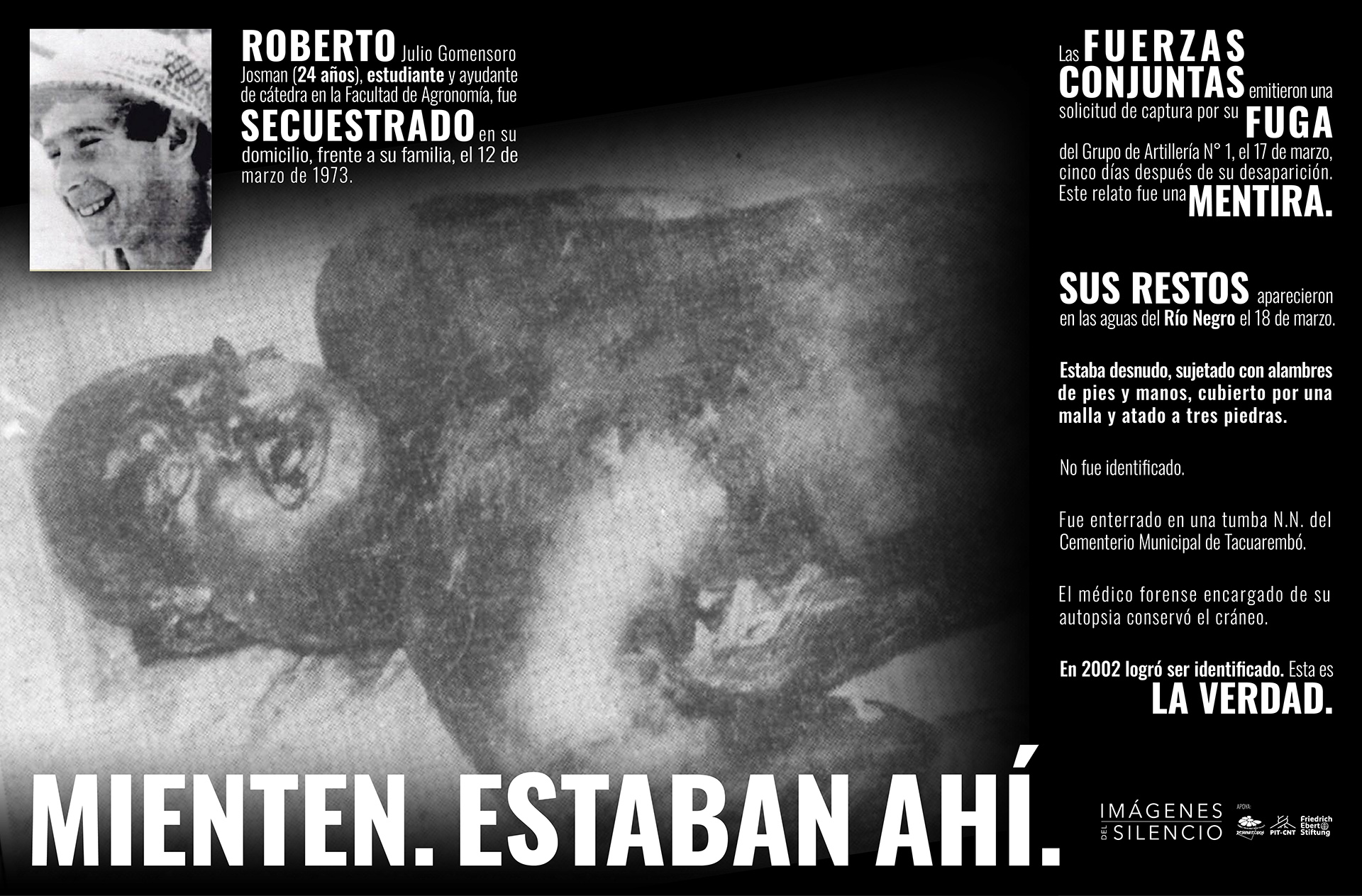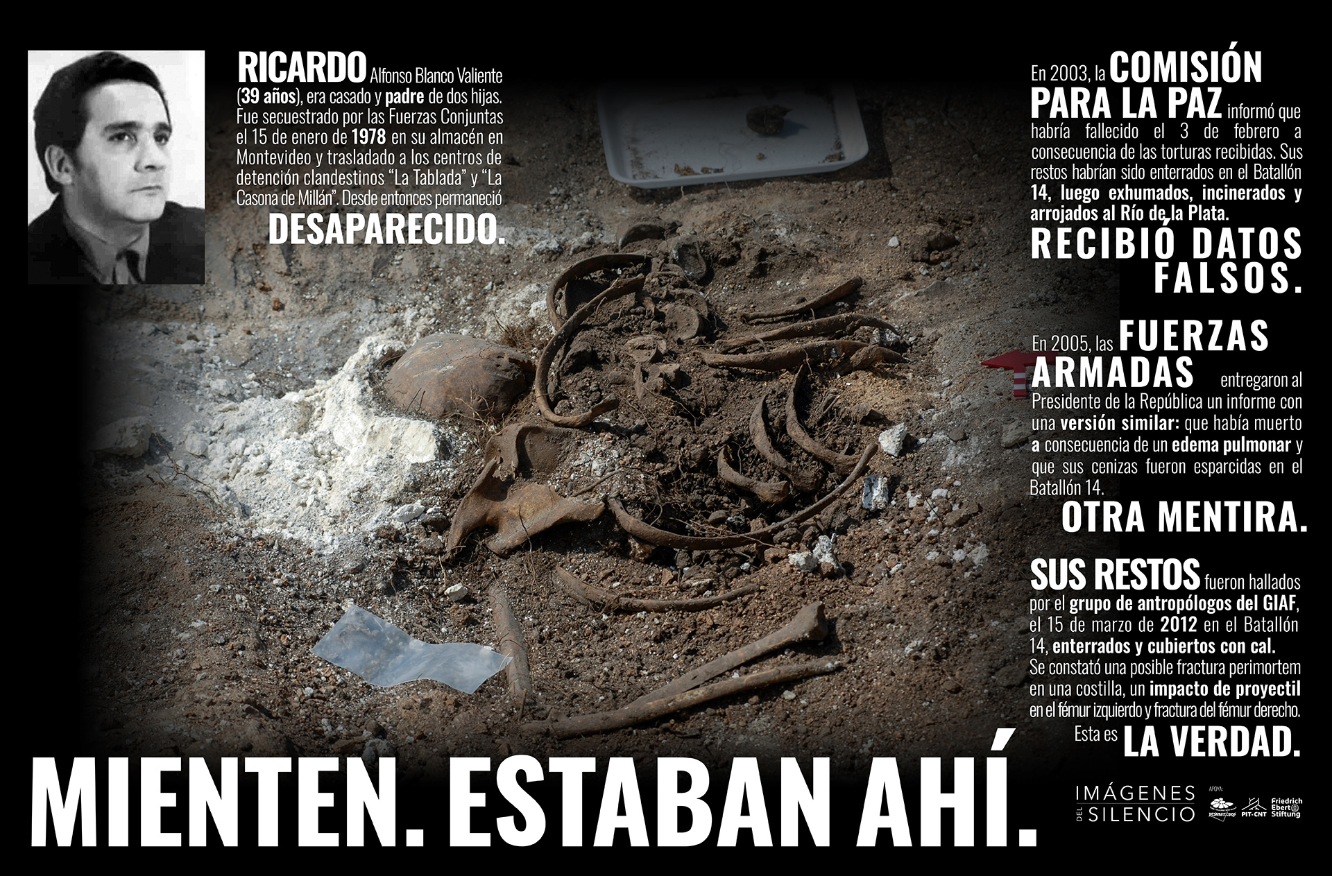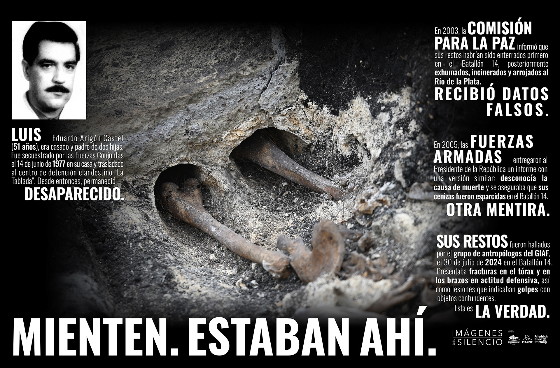 De cara a la edición 30 de la marcha presentamos el proyecto Imágenes del Silencio: Mienten, estaban ahí, que pone foco en la búsqueda y hallazgo de los restos de los desaparecidos, y en la luz sobre la verdad que esos restos van develando gracias al trabajo realizado por los antropólogos del GIAF. Para conocer lo verdad hay que comprometerse en su búsqueda.